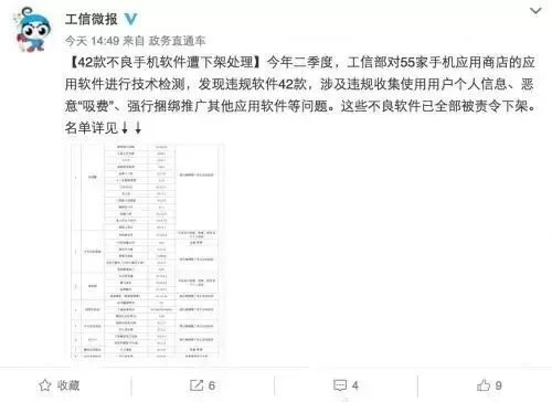 7月31日,工信部官方@工信微报 微博发布了2017年第二季度不良应用软件名单,工信部对55家手机应用商店的应用软件进行技术检测,发现不良软件共有42款。