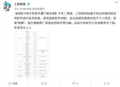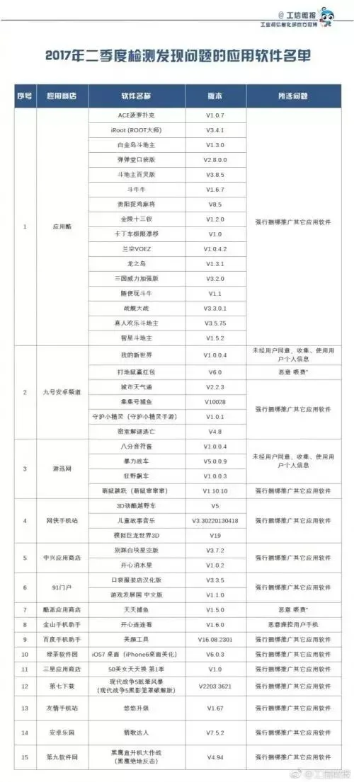 还记得手机经常收到垃圾短信,或者恶意扣费的问题吗?现在最新消息,工信部官方@工信微报 微博发布了2017年第二季度不良应用软件名单,工信部对55家手机应用商店的应用软件进行技术检测,发现不良软件共有42款。