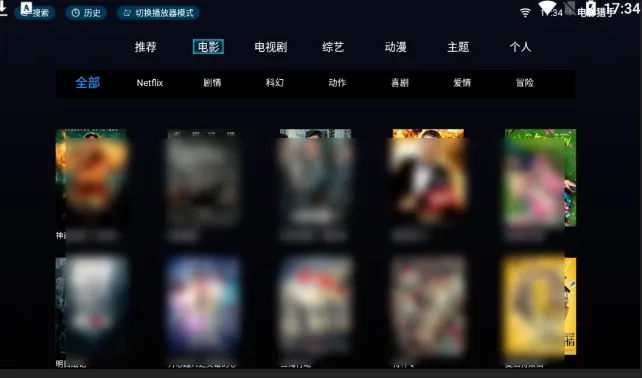 进入软件之后就可以看到界面了,这个电视盒子的壳子相信不少人都是非常熟悉的,很多盒子都用过这个,他可以切换播放器模式,包含了常见的动漫,电影电视剧等!