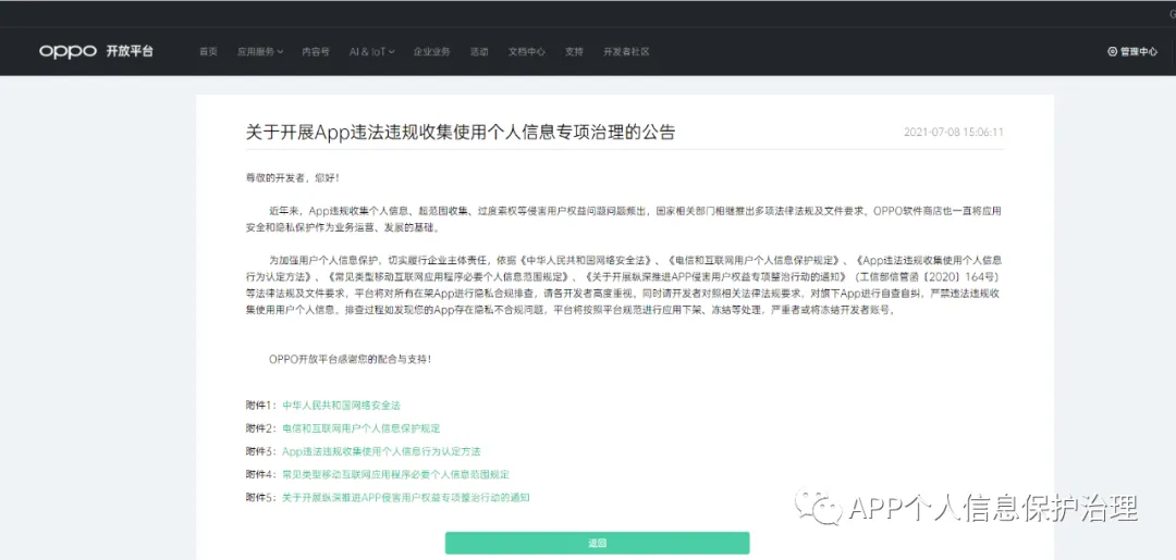 2021年7月8日,OPPO软件商店面向平台开发者发出了“关于开展APP违法违规收集使用个人信息专项治理的公告”,号召平台开发者积极开展自查自检,与平台开发者一起,为用户建设健康、安全的应用生态环境。