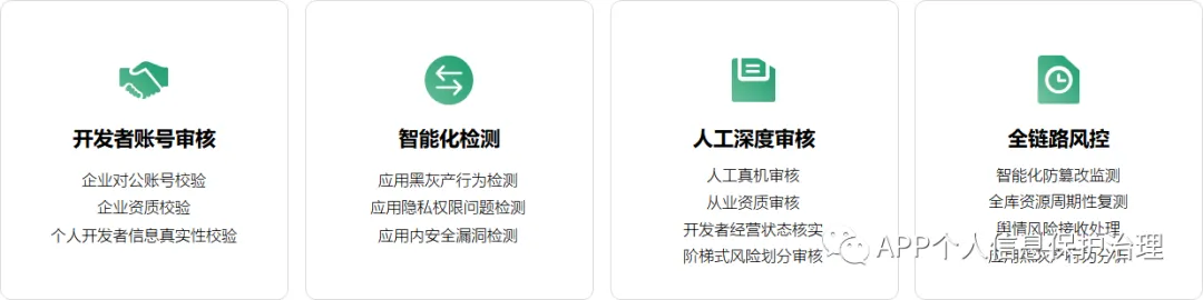 一是开发者账号审核,严控开发者准入环节。在内容安全、应用信息、功能描述、开发者相关信息、从业资质等方面制定详细要求,重点针对企业开发者对公账号、营业执照等企业资质进行校验,对个人开发者身份信息进行真实性验证,确保上线应用的开发者身份真实、可信,具有完整的从业资质。