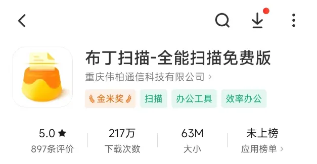 布丁扫描是一款免费、绿色无广告的专业扫描软件,能将纸质文档、证件一键扫描转成PDF格式,随时随地分享、打印,最新的布丁扫描已经集成了AI功能,可免费无限使用。在小米商城已经有200w+的下载次数,而且是五星好评,如图所示: