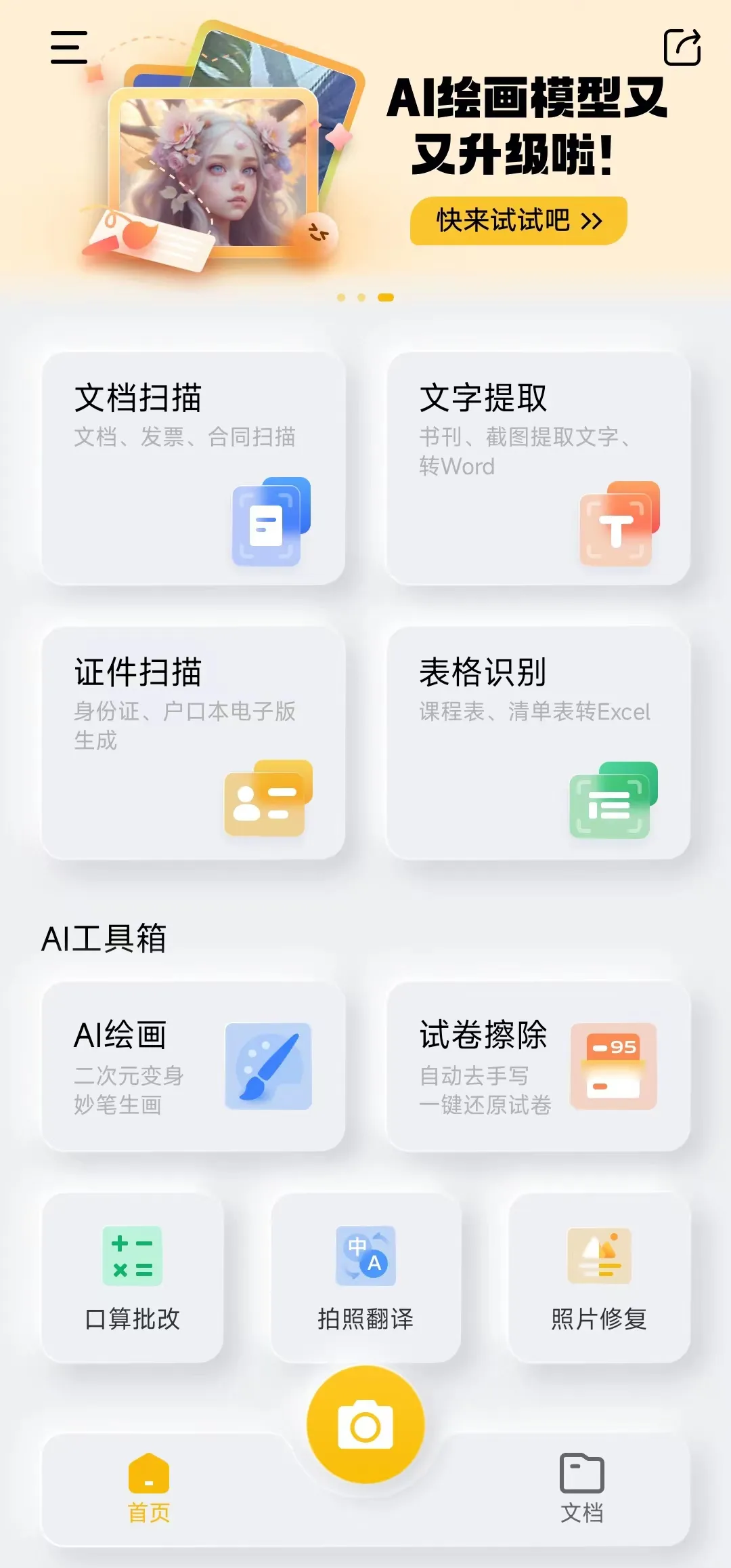 软件的功能还是很丰富的,有文档扫描、文字提取、证件扫描、表格识别、AI绘画、试卷擦除、口算批改、拍照翻译、图片修复等功能,如图所示: