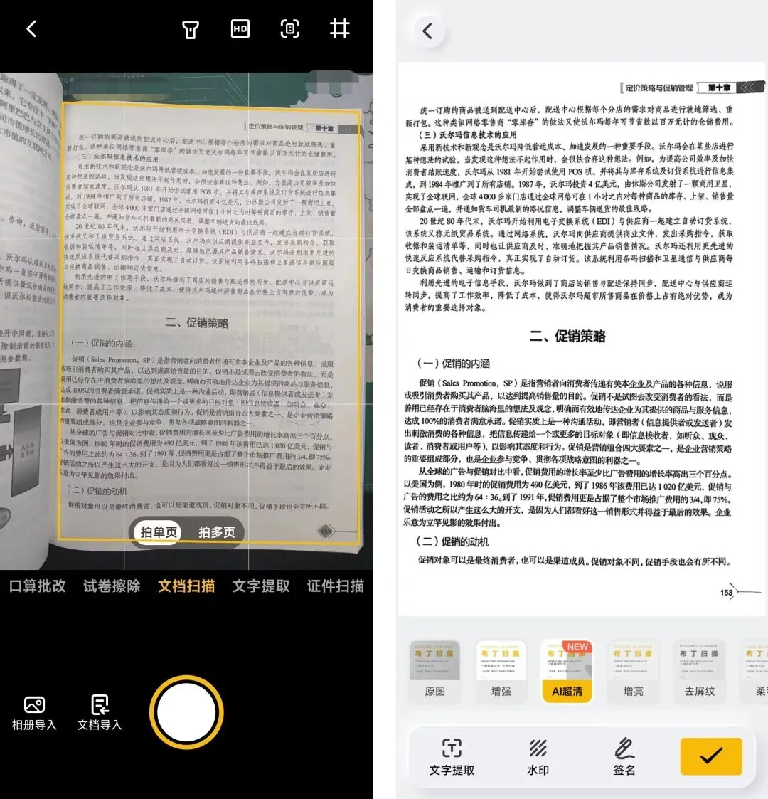 文档扫描:在拍照过程中会自动吸附纸张,这样扫描出来的结果不会歪歪斜斜。拍完后软件会自动生成清晰的文档,清晰度可以自己调节,可加水印、文字提取、签名,如图所示: