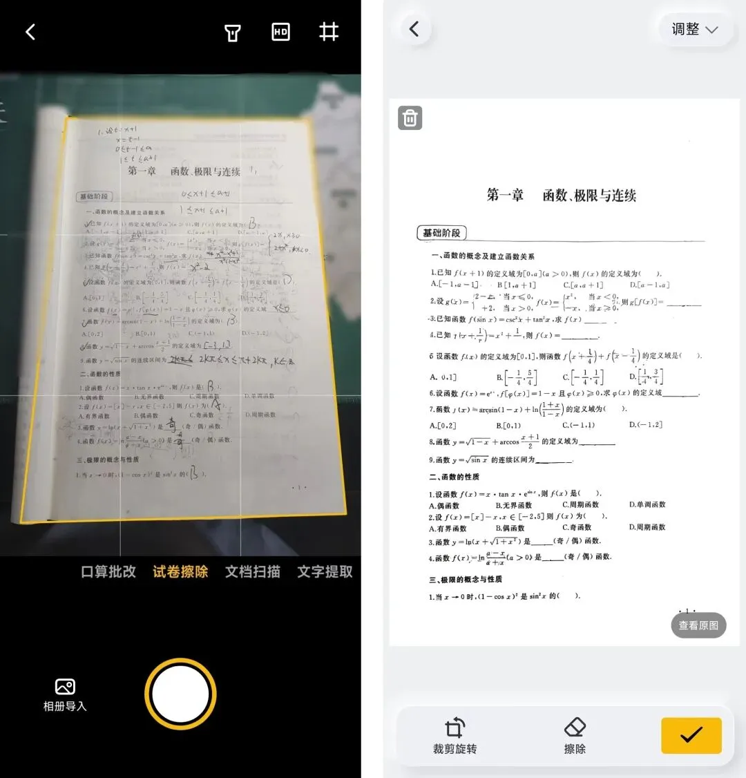 试卷擦除:这个功能就很人性化,可以一键擦除试卷中的内容,可以看下效果,所以看左边是原图,右边是擦除的效果图,如图所示: