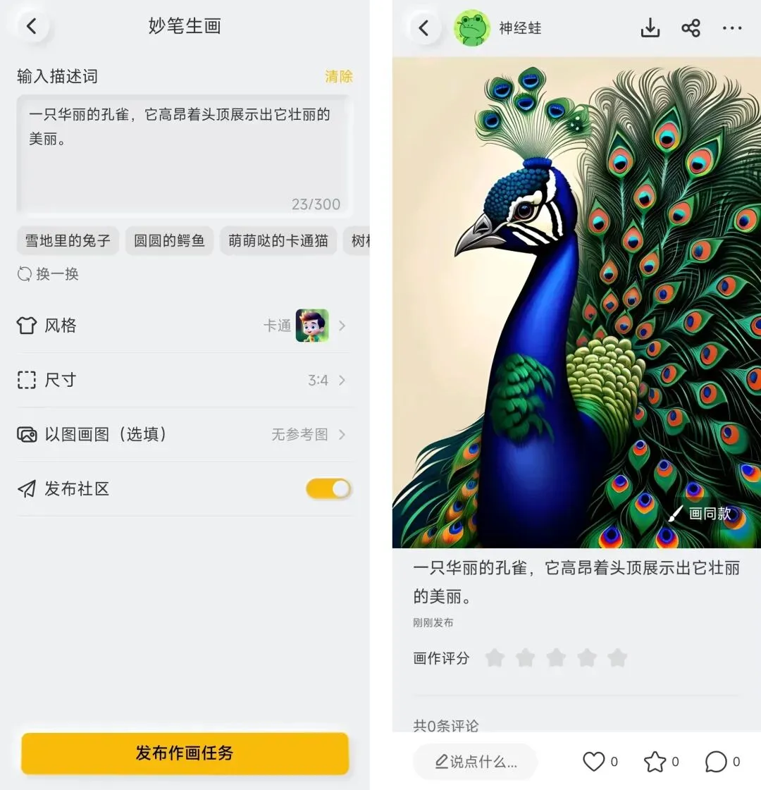 AI绘画:每天只有10次制作次数(每日0点刷新),可选择二次元变身(根据图片生成二次元风格)和妙笔生画(根据文字描述AI绘画),以妙笔生画做演示,输入描述词选择风格及尺寸,最后点击发布作画任务等待几秒会自动生成图片,如图所示: