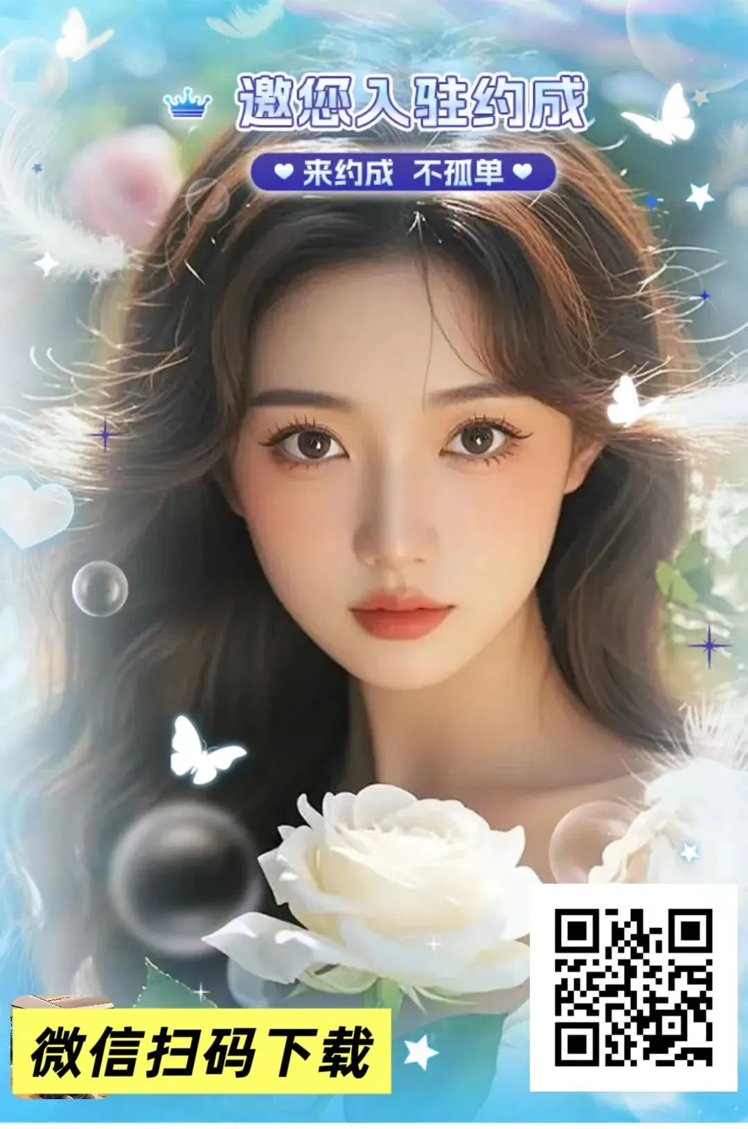 #约成App下载 微信扫码下载 “约成APP”是一款专注于单身社交的平台,主要为单身用户提供寻找恋爱对象、红颜知己等服务。该平台宣传通过微信扫码即可下载,口号为“来约成不孤单”,声称可帮助用户“一键约成