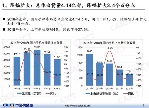 报告显示,2018年全年,国内手机市场总体出货量4.14亿部,同比下降15.6%,降幅较上年扩大3.4个百分点。上市新机型764款,同比下降27.5%。