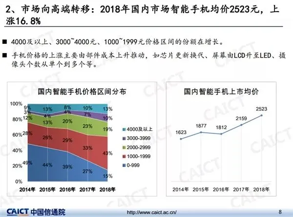 报告还显示,市场体现出向高端转移的趋势,2018年国内市场智能手机均价为2523元,上涨16.8%。4000元及以上的手机占据13%。