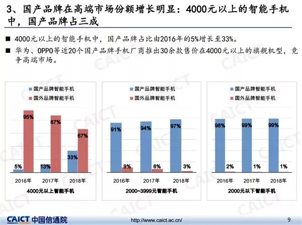 此外,国产品牌在高端市场份额增长明显,4000元以上的智能手机中,国产品牌占比由2016年的5%增长至33%。