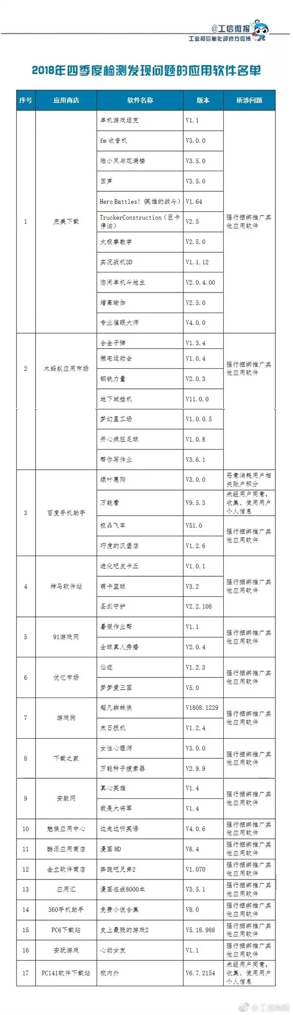 另外,工信部日前发布的通告显示,2018年第四季度组织对47家手机应用商店的应用软件进行技术检测,发现违规软件43款,目前均已责令下架。