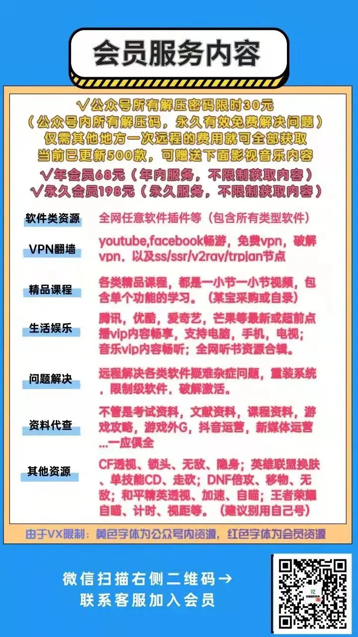 首先小会员是获取当前公众号内的所有软件,并提供高速下载通道以及问题的永久解决。考虑到人工成本,我们设了30元小会员的价格,也就是说30元获取500余款软件且持续更新,安装问题永久解决(含免费的远程服务);大会员是包含全网所有资源,影视音乐、小说游戏、任意软件、插件课程、行业及学习资料、宅男资源、网游外G等各类资源,具体可以看下方图片介绍。