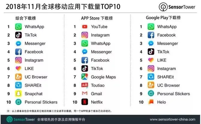 11月全球手机应用下载排行榜:中国APP排名亮眼