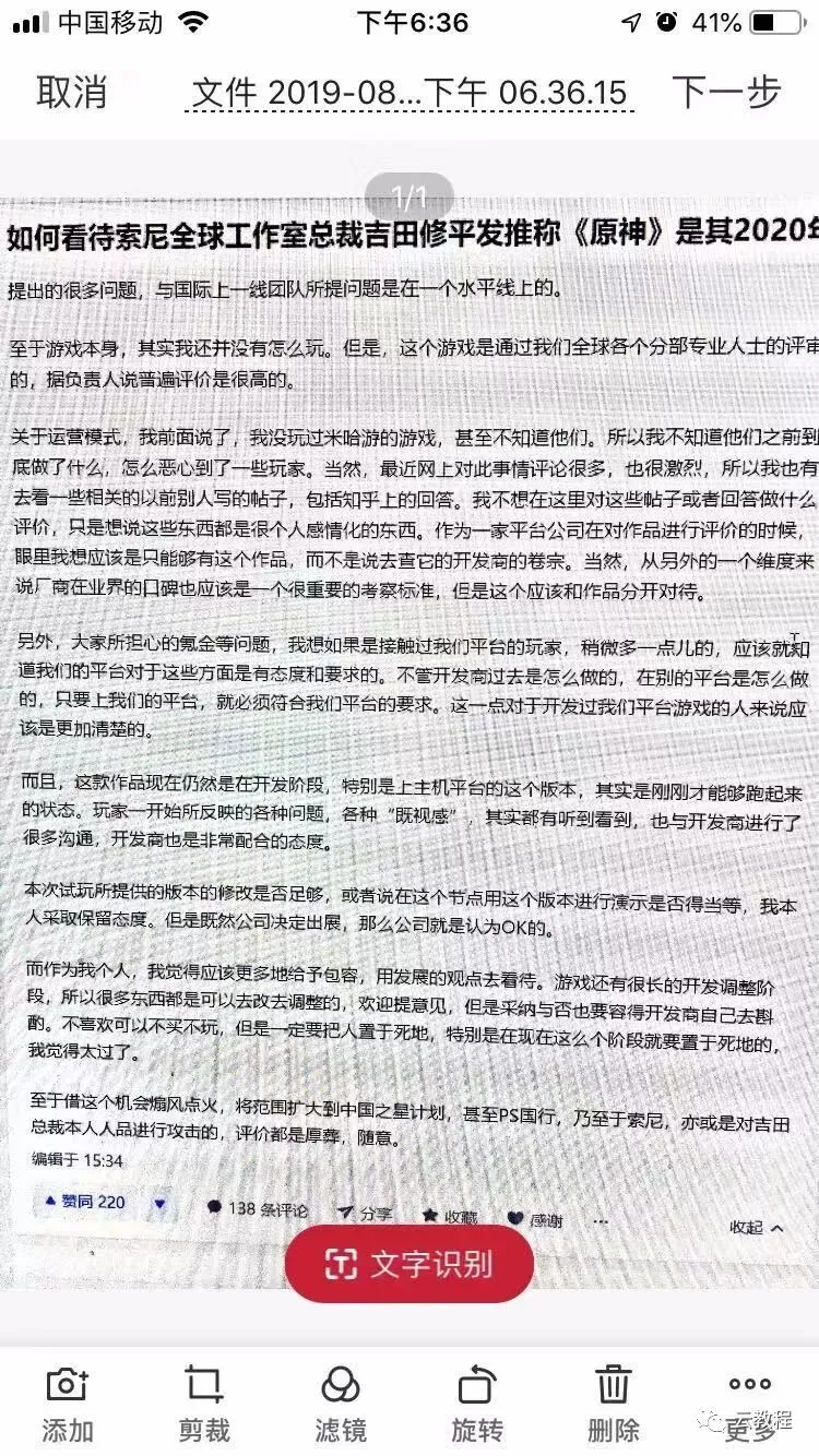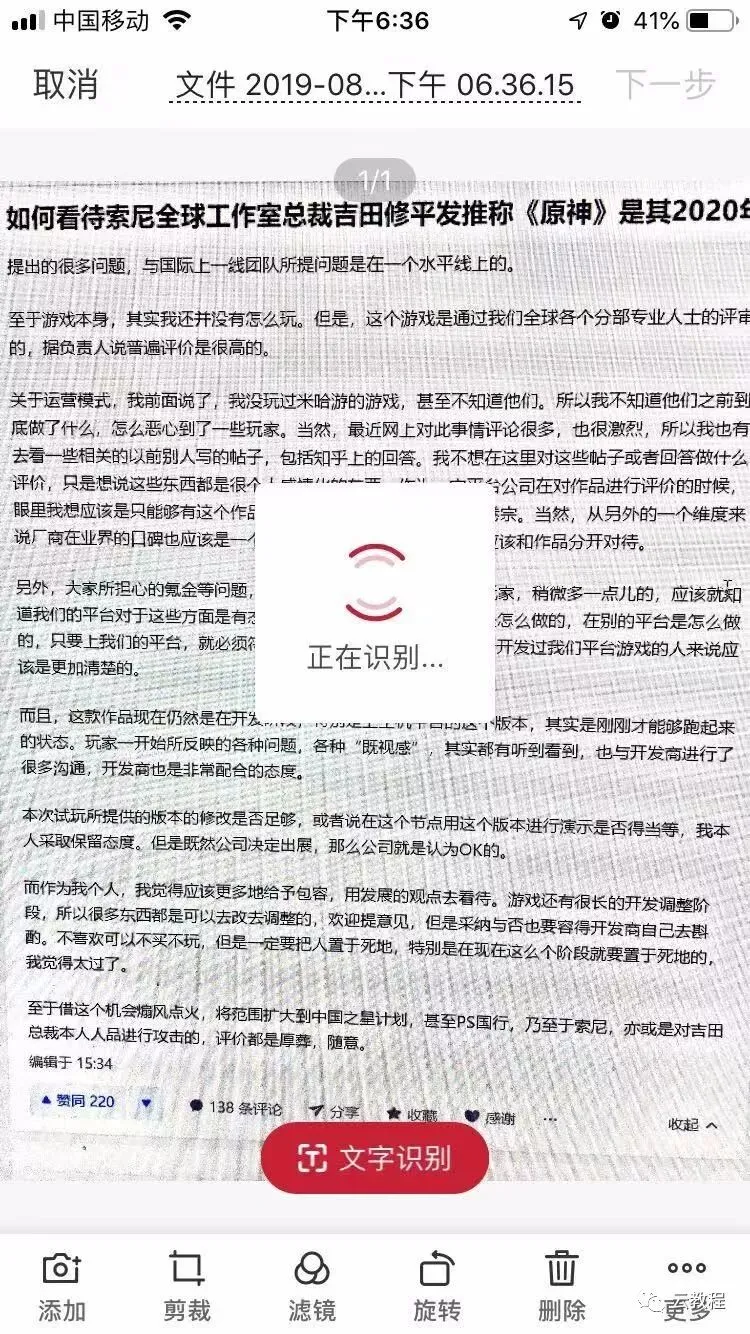 点击了上述的红色+符号就会进入扫描界面,这里随便选择了知乎中的一段进行扫描,选中你需要的文本,点击文字识别