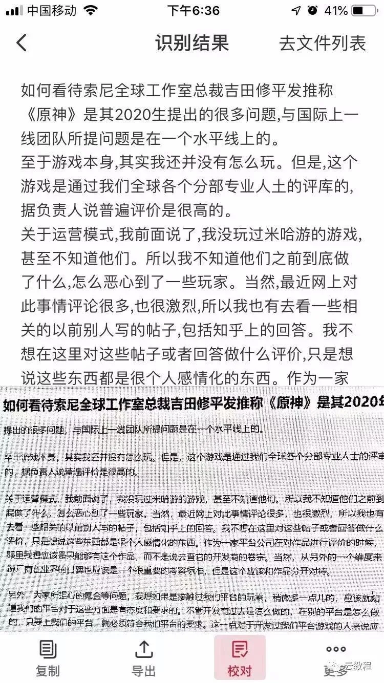 下面是文字识别出来的结果,如果不放心可以进行校对改正,修订好之后可以选择直接复制或者是导出