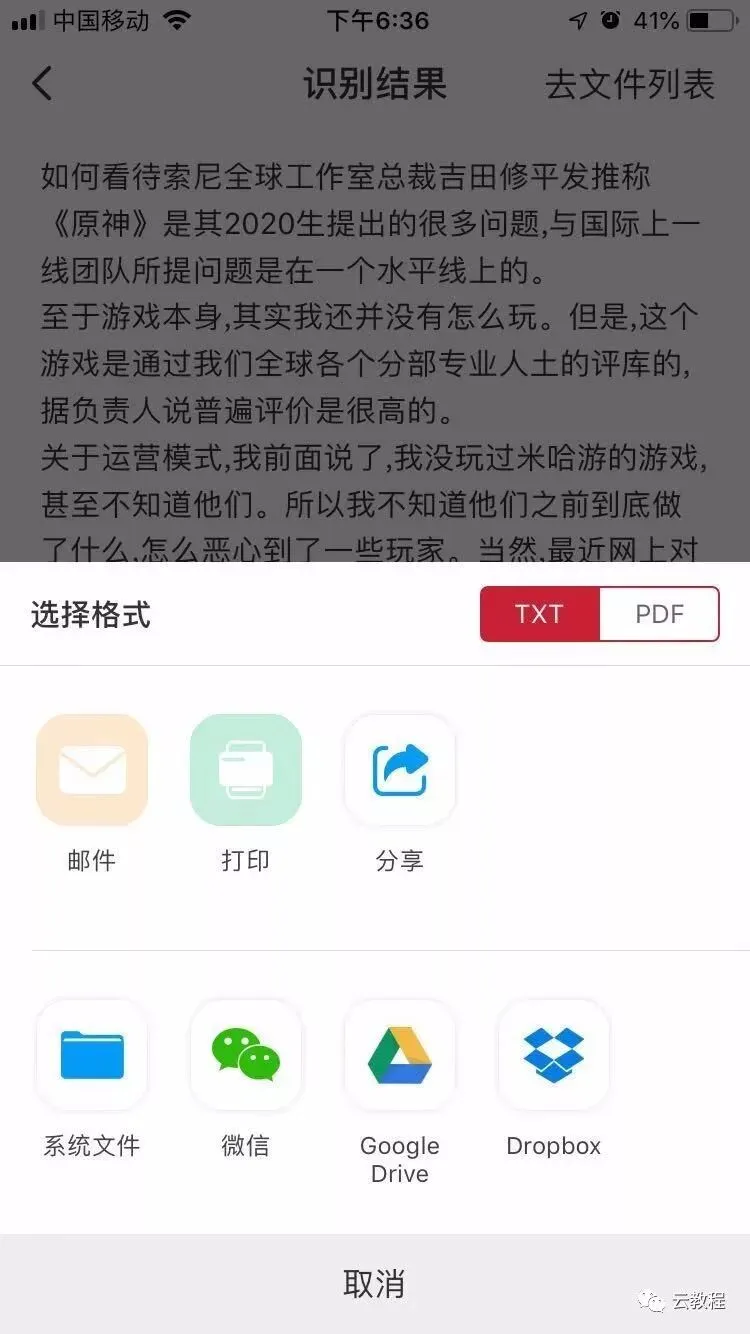 这里小编选择导出到微信,记得选择导出格式哦,有TXT和PDF两种格式