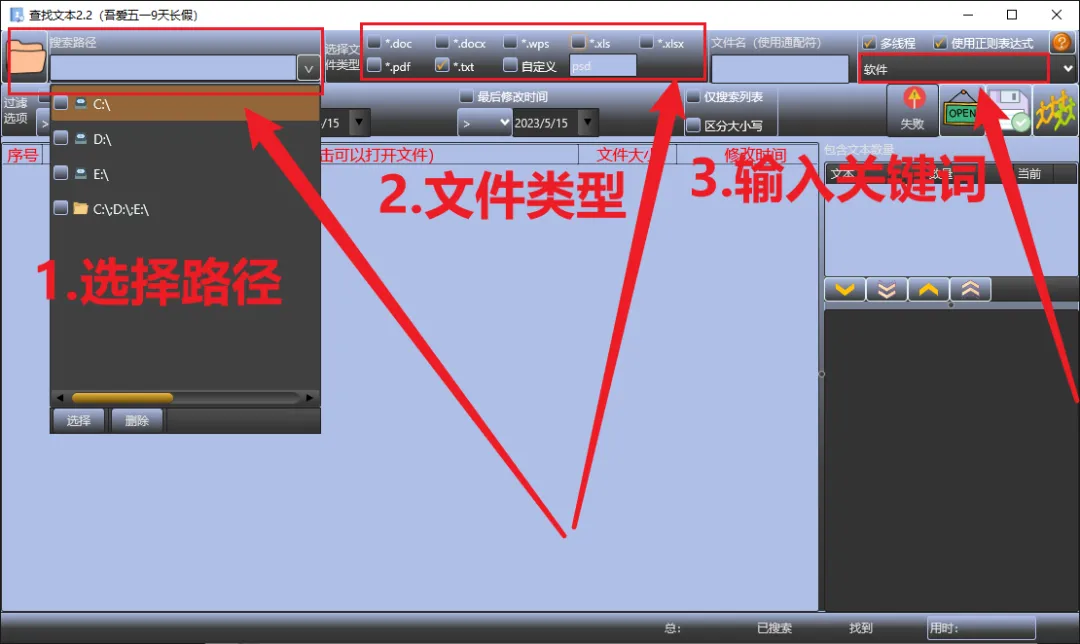 虽然界面看起来比较复杂,但实际上操作非常简单。只需要选择搜索路径和文件类型,并在右上角输入关键词,即可快速找到所需文件。