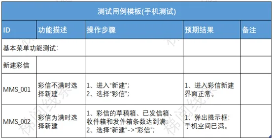 以手机测试为例,进行功能拆分后,其中包括:基本菜单功能测试:新建彩信。基本菜单对应测什么(what),功能对应为什么测(why)。