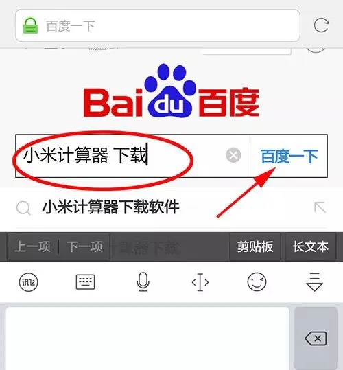 比如我们要下载“小米计算器”这个APP,我们在百度网页的搜索框里输入“小米计算器 下载”,点“百度一下”。