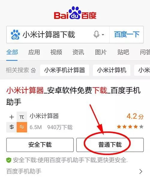 选“普通下载”。为什么我们不选“安全下载”呢?因为点“安全下载”会直接去下载“百度手机助手”。
