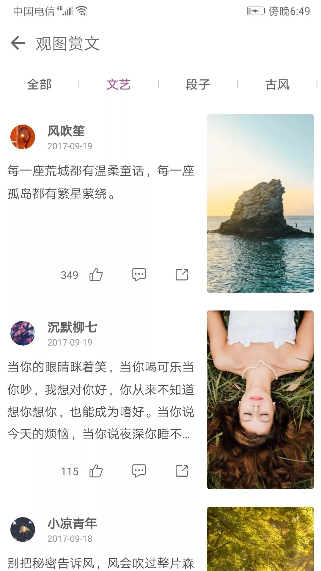 在观图赏文里面,你一定能根据不同分类找到特别喜欢的一句话,然后点赞,评论,释放自己……