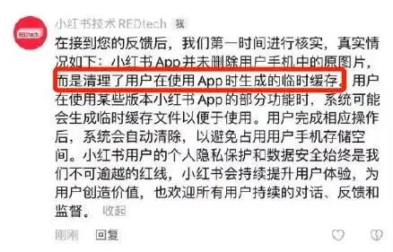 针对“后台删照片”一事,小红书官方认证的账号回应称,小红书App并未删除用户手机中的原图片,而是清理了用户在使用 App 时生成的临时缓存。