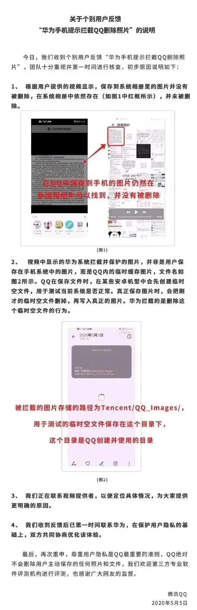腾讯QQ的回应是,华为手机拦截并保护的图片是QQ内的临时缓存图片,保存在系统相册的照片并未被删除。