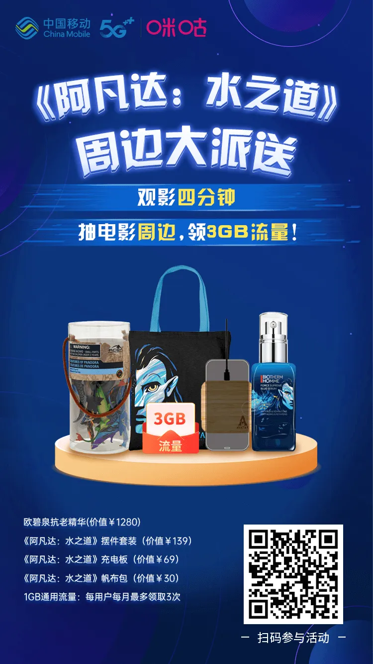 即日起至4月30日,登录咪咕视频APP,每日观看《阿凡达:水之道》电影达4分钟,即可点击视频右下角的“观影抽好礼”提示语,获得1次拆红包机会,随机抽取阿凡达实物奖品和1GB通用流量。1GB通用流量每用户每月最多领取3次。