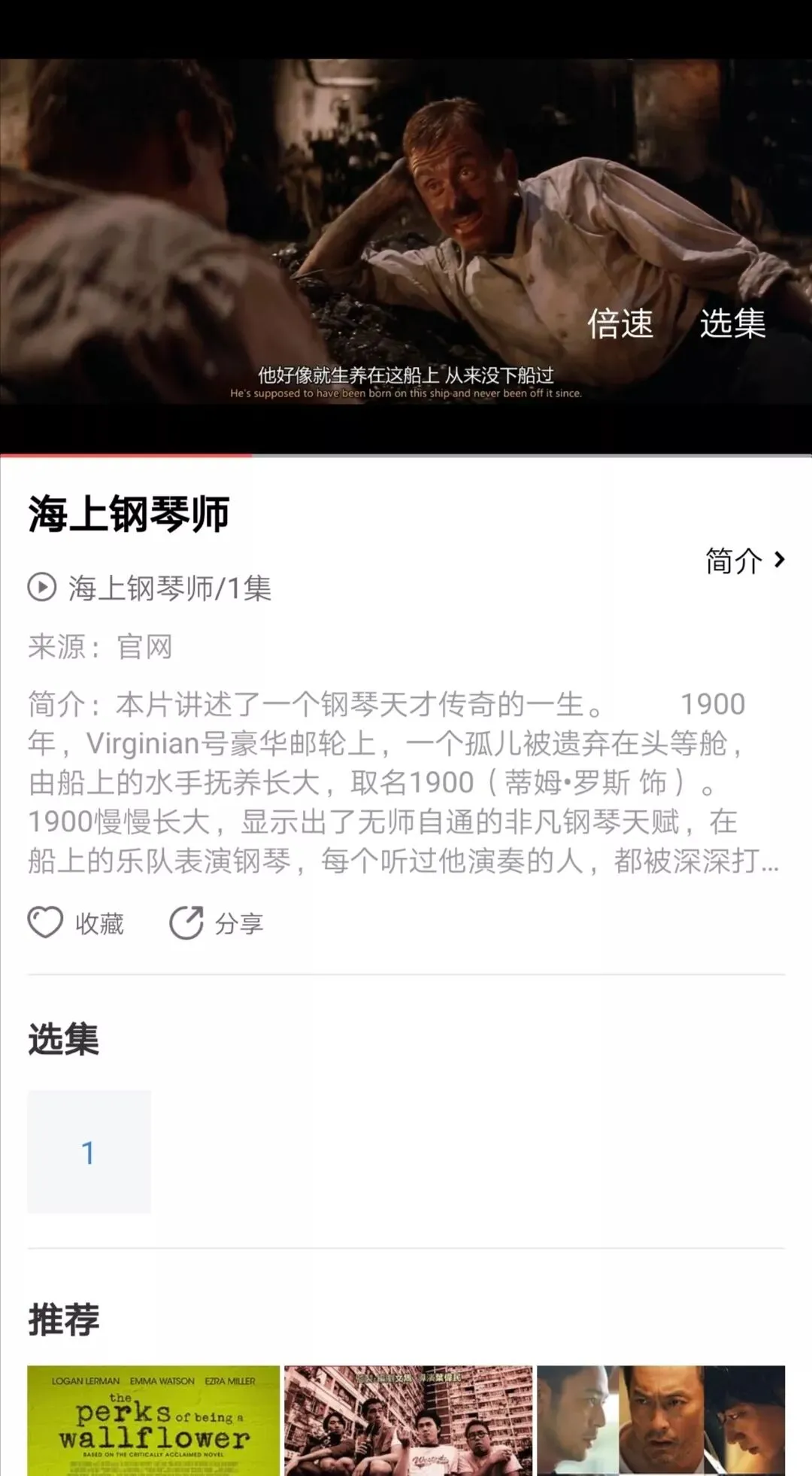 这款软件给我用户体验最好的三点,第一,资源丰富,上到远古时期的视频,下到影院还未下映的应有尽有,下图有海上钢琴师为例。第二,全程无广告,整款软件没有出现一丁点广告。第三、播放速度很快,基本上不需要等待时间。
