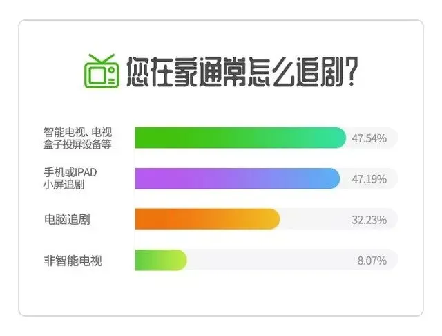 数据显示,传统电视和电脑追剧方式似乎已经过时了,等待电视广告和用鼠标操作体验都不是很理想。值得关注的是,47.54%的用户已进入大屏智能化的观看场景,通过智能电视、手机投屏等方式观看越来越流行。