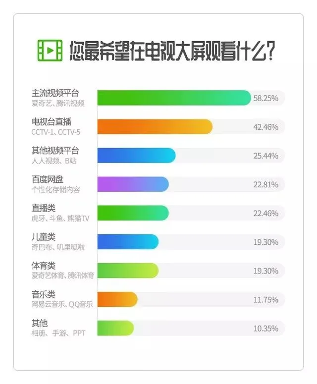 随着4G和家宽网络的提速,主流视频平台和新兴视频直播平台开始分流传统的电视收视率。打开电视后,有58%的用户停留在爱奇艺、腾讯视频、优酷三大平台上,42%用户开始通过网络方式观看CCTV这样的电视频道。而B站、虎牙、斗鱼、熊猫TV等新兴的视频平台也逐渐成为年轻用户消遣时间的新方式。
