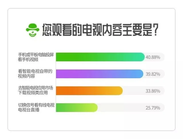 统计显示,44.8%的用户是通过手机、平板电脑的投屏功能看视频的,而切换信号看有线电视的电视台直播占25.79%。这一点说明手机APP的投屏操作方式已变得足够简单,而有线电视的电视台直播频道,遥控器的切换方式对于用户寻找内容显得并不直接。