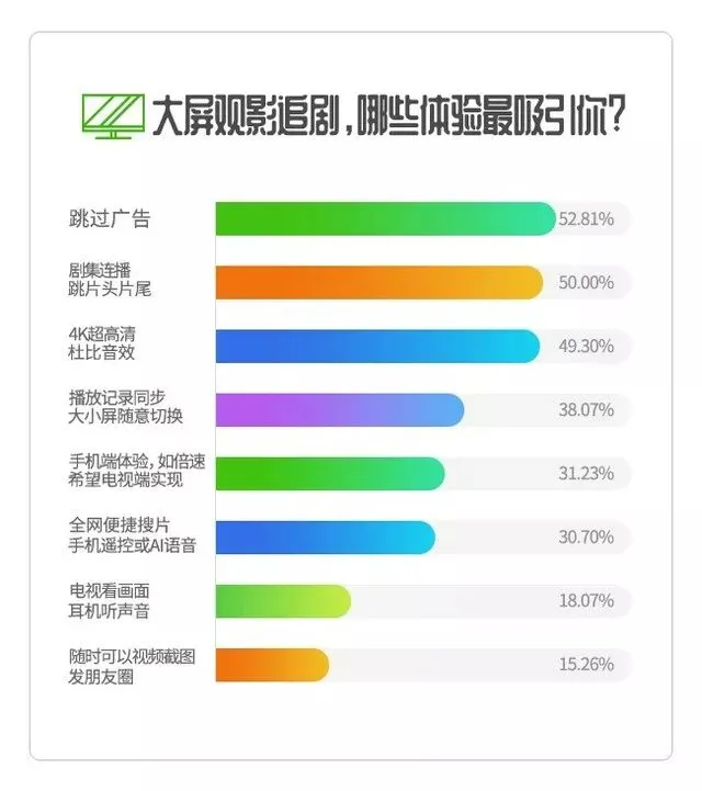 观看过程中,大屏观影追剧的体验中想必大家对多则60秒以上的广告槽点最为关注。因此52.81%的调研用户都选择跳过广告这一项。而投屏功能方面,剧集连播和跳过片头片尾也是增加观看连续性的重要吸引点。