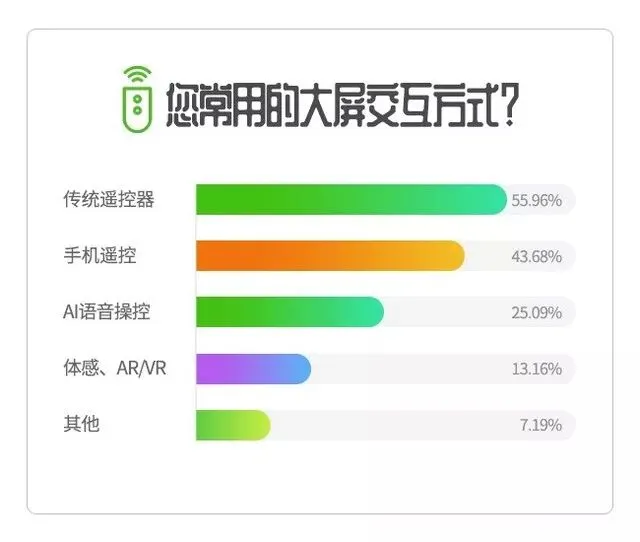 通过实际调查显示55.96%的家里面还是用传统遥控器进行交互,从使用习惯上来说,并没有抛开物理按键的方式,这也是要照顾到全家人的操作体验。值得关注的是,更多用户开始习惯在手机来操控电视,43.68%的用户不再陷入找遥控器的困惑,一个APP基本上就可以搞定所有的播放流程,语音操控和体感操控也十分收欢迎。