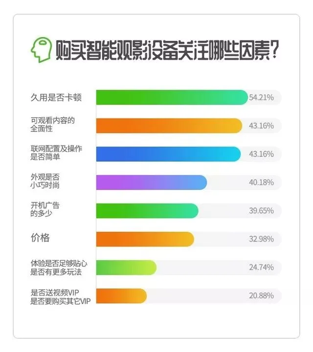 至于购买智能观影类设备的考虑,54.21%的调查用户选择了用久了是否卡顿。安卓系统的智能观影设备,使用中会安装各种APP,系统会越来越重导致卡顿,因此大家比较在意后续性能下降的问题。系统轻量化的爱奇艺电视果等投屏智能硬件,无软件安装,不受卡顿问题困扰,占据较大优势。