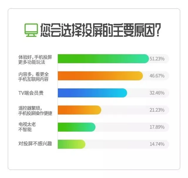 电视投屏不仅只是一个简单推送功能上的升级,51.23%用户选择投屏方式希望获得更多功能的玩法。而内容丰富,看更全手机互联网内容也是用户最为在意的地方,21.23%的用户认为遥控器繁琐手机投屏操作更便捷。