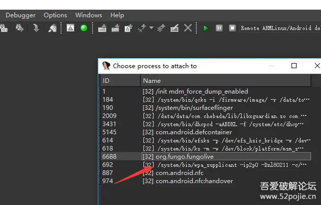 输入上面的指令后,点击Debugger的Attach to Progress就可以看到需要的调试的进程了,如果没有显示进程,请确认android_server文件是否已经被赋予执行权限,并且以root模式启动,jdb附加后就可以正常调试so了