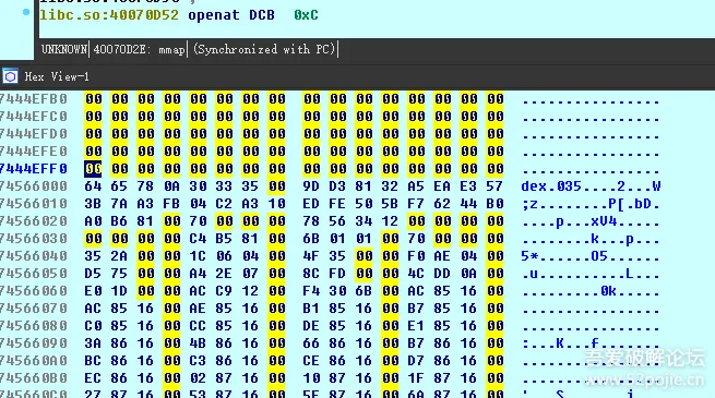 对关键地方下断,就可以对此处寄存器值进行修改,达到反-反调试的目的,处理完这个就可以很轻松的拿到dex