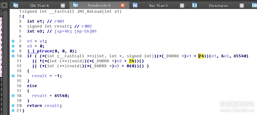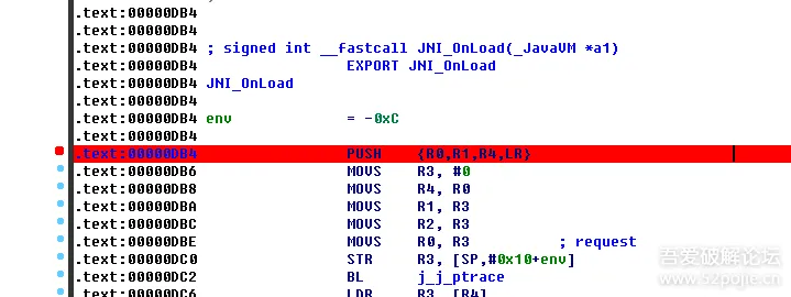 知道so有反调试后,我们可以尝试静态附加,直接断在Jni_Onload处,下断