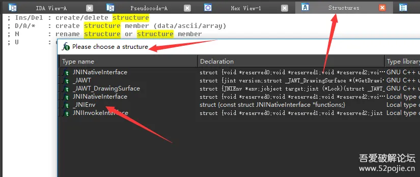 在Structures标签处按下键盘下的insert按钮点击添加,添加jniEnv和javaVM两个指针,修改后的代码如下