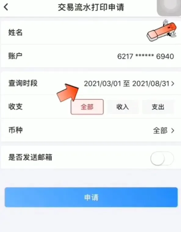 选择【账户、查询时间段】,输入验证码,点击【我要申请】;