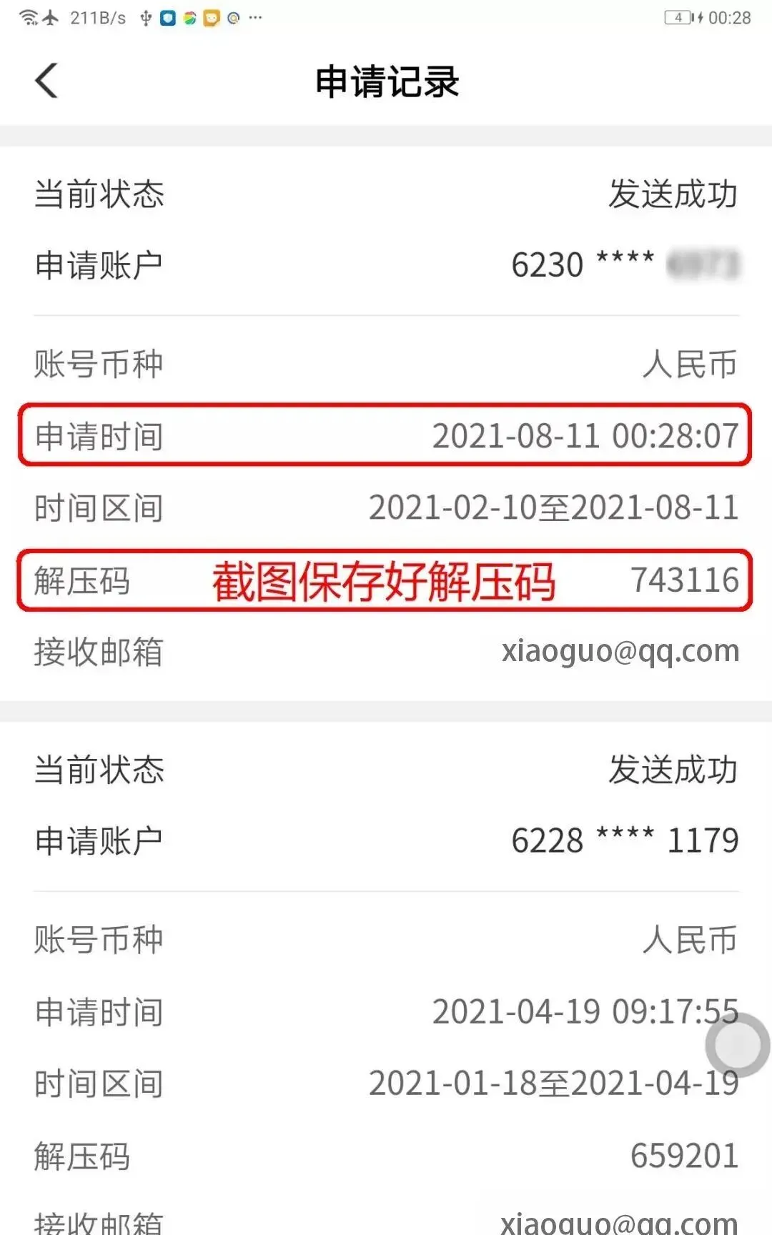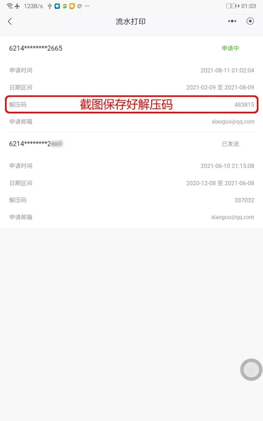如果上面一步忘了截图,可以重新进入到第2步中,点击底部的【申请记录】,查看解压密码。