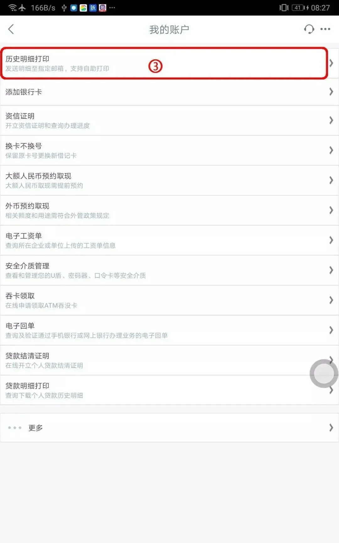 手机银行APP首页点击【更多】下拉到最下面,选择【交易流水打印】。