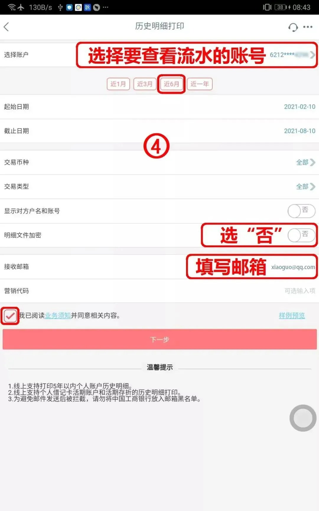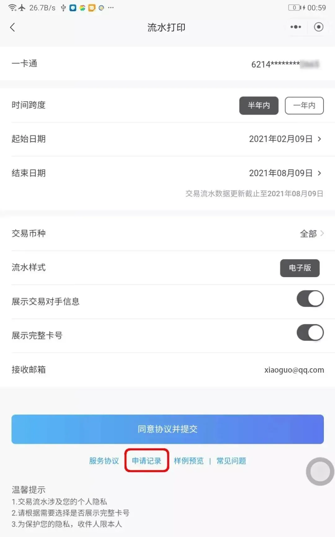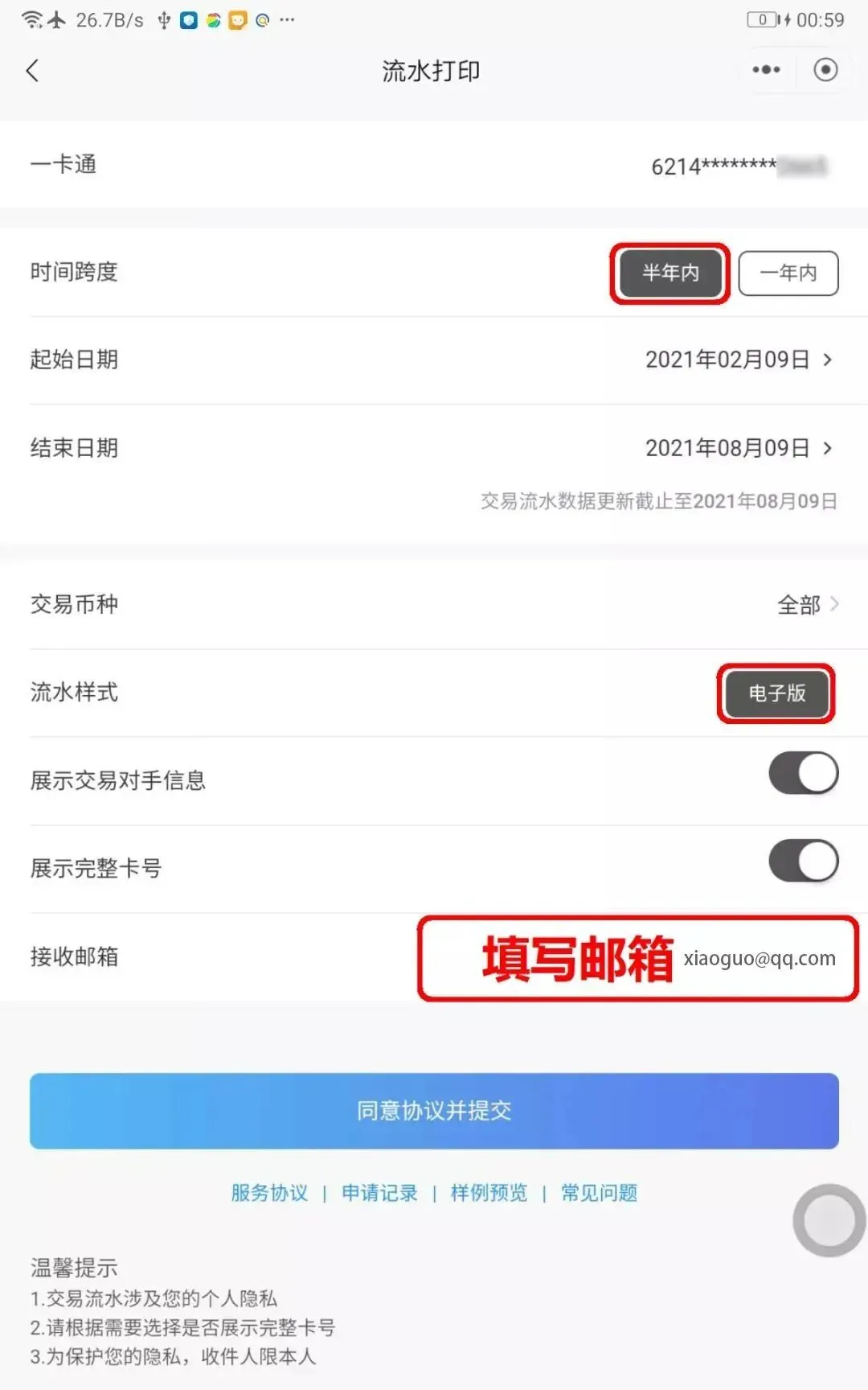 确定需要【打印流水起止日期】,输入【接收邮箱】,选择【同意协议并提交】。