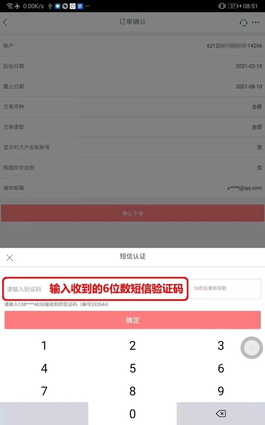 确定后,输入手机接收到的【验证码】,申请【提交成功】,流水发送到你的【邮箱】