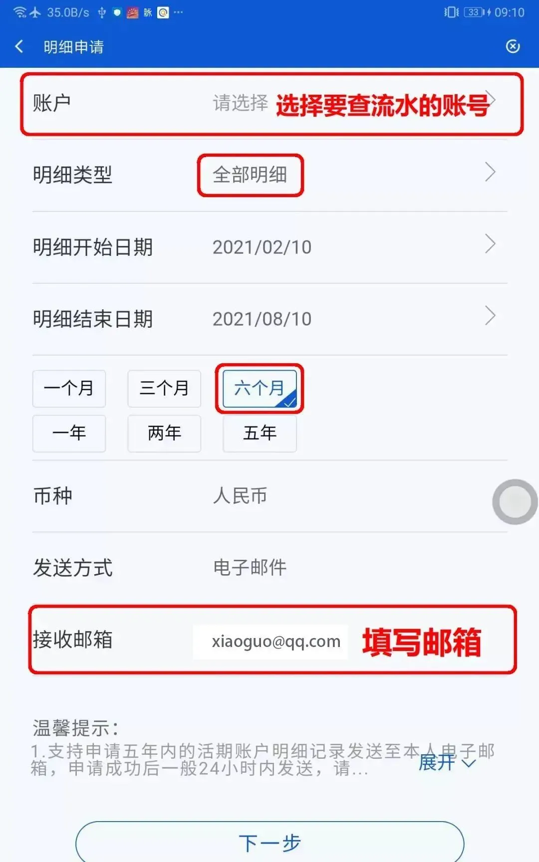 选择【查询时段】,输入【接收邮箱】,点击【下一步】提交申请;