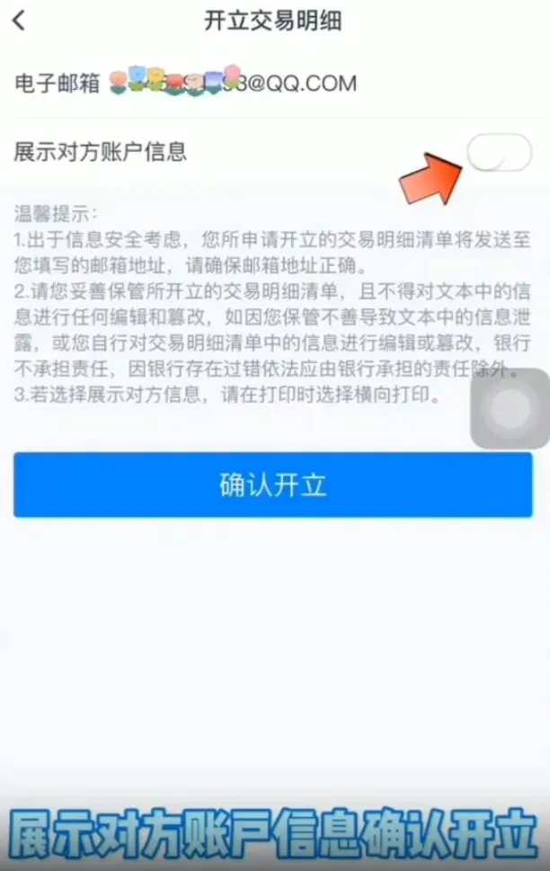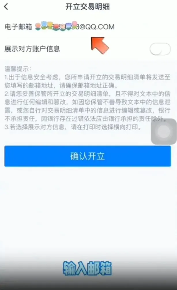 输入【邮箱】,点击【展示对方账户信息】,点击【确认开立】,输入【交易密码】,开立成功