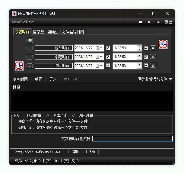 如果你有一些文件需要通过按照时间来排序,但是文件的时间比较混乱的情况下,你可以利用这款「NewFileTime」修改文件创建/访问时间的工具,支持拖放或者添加文件、文件夹,然后设置你需要的时间即可。