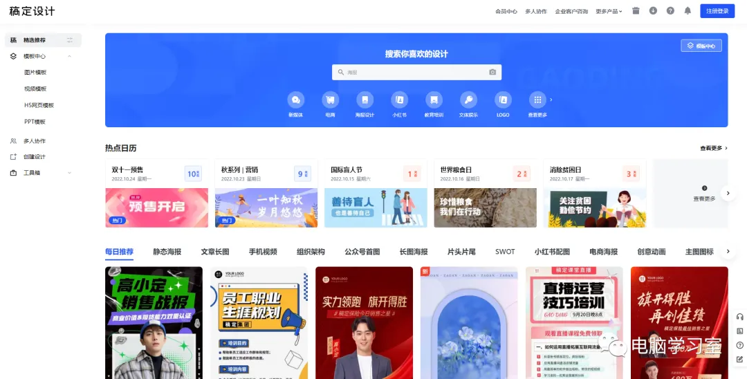 那么我就推荐这一类人使用一下稿定设计这是一个功能很强大的在线设计网站,所有设计都可以在站内找到相应的模板,进入模板后在线编辑,替换成自己想要的文字图片就可以