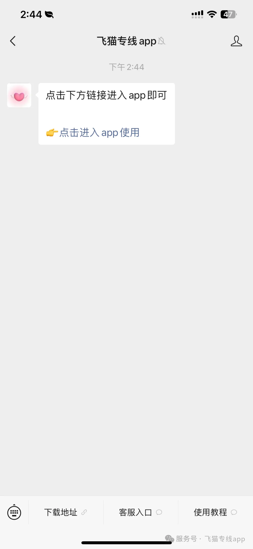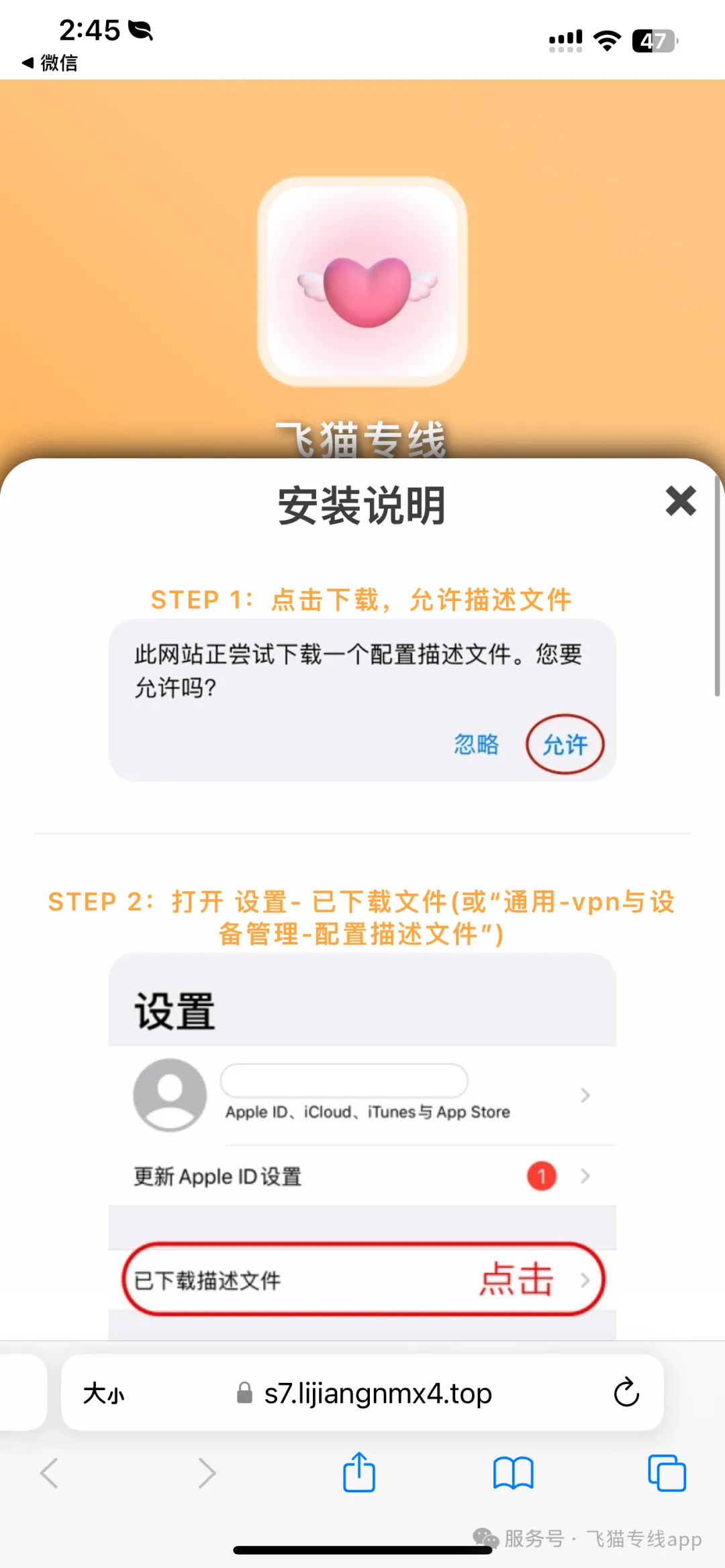 飞猫专线app苹果使用教程,飞猫专线苹果和解电话使用,飞猫专线苹果使用最新入口 APP版飞猫专线使用教程(请优先使用APP版本 通道更稳定) APP版使用教程(5步搞定) 1.点击APP下载链接 2.点击下方网址 3.点右上角 4.打开浏览器 5.按照步骤下载安装即可